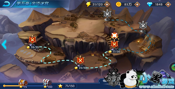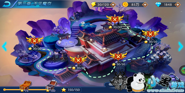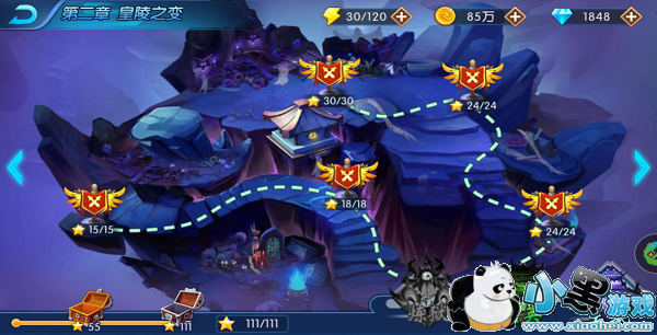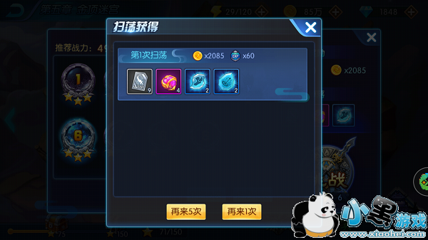 每张地图系统会根据您的通关表现(漏怪数目)给您打星,零星即为不通过,三星为满分,只有三星地图才能扫荡。每个章节评星数累计到一定数目可以打开神秘宝箱获得金币、钻石、装备。有点要提的,首次通关地图奖励经验和金币是以后的十几倍。