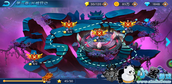 每种模式又分为5章(目前本人只解锁到第5章),分别为:《第一章长城异动》、《第二章皇陵之变》、《第三章不平魔都》、《第四章震慑雪岭》、《第五章金顶迷宫》。每章分为3到5大关,每关又分为1~10张地图。可以说最大限度的满足爱好塔防玩家的您。
