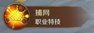 向后跳跃10米,并在起跳位置周围5米放出捕网,使范围内最多12个敌人定身,持续5秒,并在30秒内每3秒受到13点流血伤害(随攻击力提高),并提升自身移动速度30%,持续3秒。