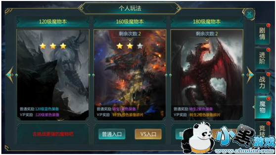 普通副本产出蓝色装备箱,贵族副本产出紫色装备箱。点击主界面右上角“个人玩法”图标,选中“魔物”页签