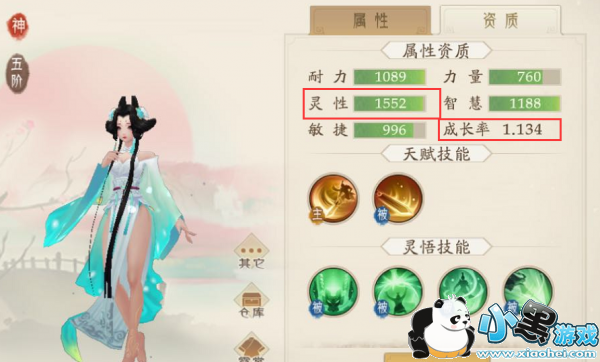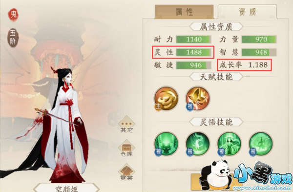 我选取2+4技能且初始成长满,灵性1488的空颜姬作为护驾1的选择(耐力 力量 智慧 和敏捷的属性也非常不错),是个很好的炼妖胚子: