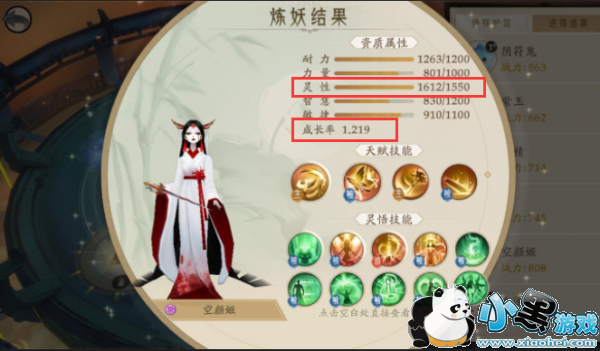 可以和预览图作对比,其中成长率已经达到了预览的最高值1.219,灵性也突破了1600,技能数量也突破了期望值的9个,可以算作是炼妖成功。