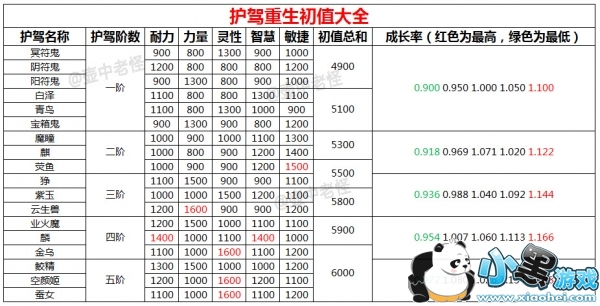 首先明确自己炼妖是为了合成什么资质的护驾,简单来说就是要攻宠、法宠还是肉盾。切不可心血来潮,觉得初始成长或者资质不错就乱炼,下面我整理了一下目前所有护驾重生后的最佳属性初值以及成长率。