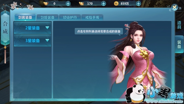 注意:默认进入的是剑客的装备合成,剑姬请点击选择第二个菜单。