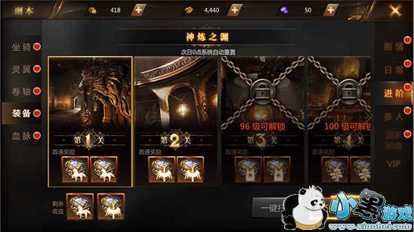 2、进阶副本是为提升坐骑、灵翼、卷轴、血脉、魔环、饰品、装备等进阶系统等级所需材料的主要产出途径;