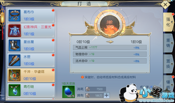 另外,装备强化需要消耗地灵石和银币,当强化到一定等阶之后,需要消耗天灵珠进行突破,突破之后的装备才能继续进行强化。地灵石可以从打怪中获得或者前往龙币商店购买,银币可以从日常任务、在线有礼、等级礼包等处获得,天灵珠可以从副本中获得或者前往龙币商店购买。除了强化之外,玩家还可以选择全身强化对全身装备进行强化。