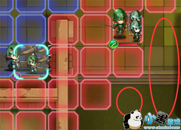 之前说到这里有一个小技巧,其实很简单,如果你不在对方的攻击范围内或者该小队的攻击范围内,敌人是不会主动攻击你的,所以,我们沿着左路一路冲过去即可。斯科特和艾美达可以朝上直接冲,但是注意不要进入左方弩车射程,如下图,红色圈圈范围即安全范围