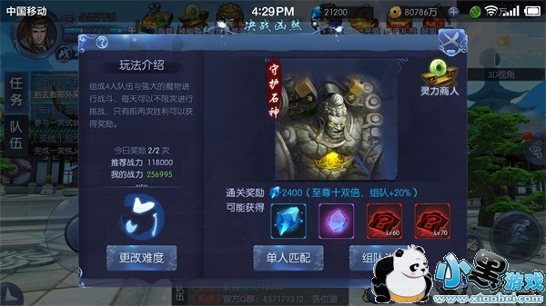 【基本规则】玩家等级达到14级开启决战凶煞玩法,该模式有不同的难度等级,对应不同的奖励提升角色等级可以挑战更高级的凶煞!该模式需组队进行,决战凶煞每日可挑战2次,不消耗体力,好友组队进入可以增加20%的收益.