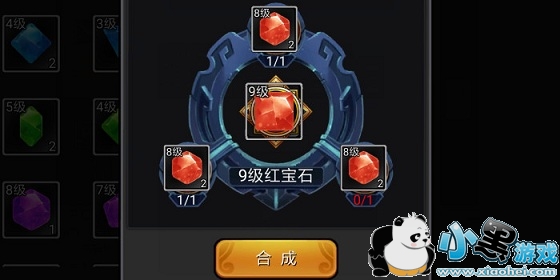 宝石共分为12个等级,最高等级为12级,3个同类型同等级的宝石可以合成1个更高级别的宝石,显而易见,要想获得1个九级红宝石,可以用3个八级红宝石合成(如图)。