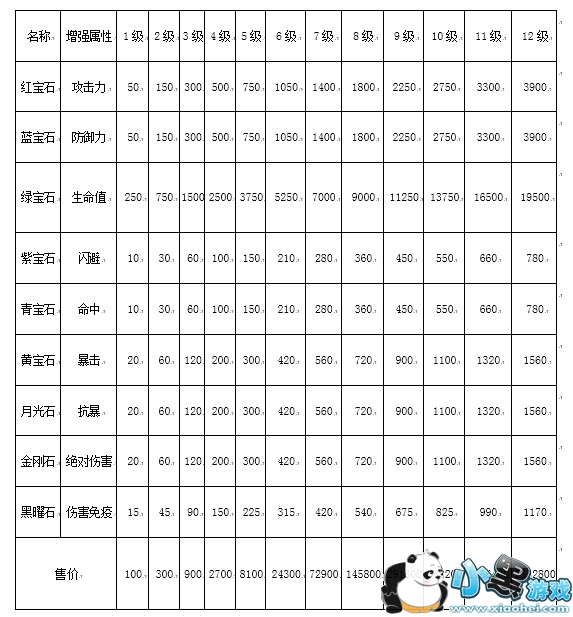 每一种颜色的宝石带有一种属性,其中红宝石可以增加队伍攻击力,蓝宝石可以增加队伍防御力,绿宝石可以提高队伍的生命值,紫宝石可以提高队伍的闪避数值,青宝石可以提高队伍的命中数值,黄宝石可以提高队伍的暴击率,月光石可以提高队伍的抗暴率,金刚石可以提高队伍的绝对伤害数值,黑曜石可以提高队伍的伤害免疫数值。宝石等级越高,相对应所增加的属性就越多,其中,黄宝石、月光石、金刚石每升1级所提高的数值要比其他宝石多,相应所能提高的战力也多。值得一提的是,宝石还有相应的售价,价格也随着宝石等级的提高而相应增加。由下表可以清楚的了解各种类型和等级的宝石对武将的属性加成以及宝石的销售价格。(以下数据根据玩家版本不同或有所不同)