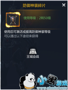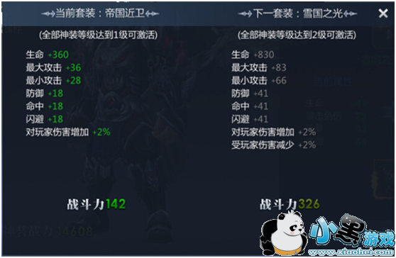 消耗攻击神装碎片、防御神装碎片来进行神装升级,全部神装达到对应等级时可以激活不同的套装属性!