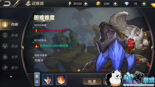 试炼场是玩家直接挑战boss的场所,这里面的boss共包含灼烧、剧毒、流血、全能、重伤等五种属性,每种属性里面又包含了简单、困难、专家和噩梦等难度系数。玩家每天可以挑战3次,挑战胜利可以获得强化材料跟强化符石。通过挑战的boss也可以扫荡获得材料。