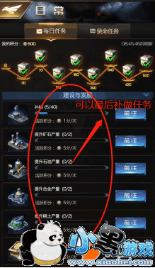 三,建设与发展:备选积分,为什么这么说呢,如果有未完成的话,可以用这里面的任务来补充,其中的补给、提升矿石产量、石油产量、合金产量、稀土产量,都是可以做备用的,而且不需要上来就完成,可以留到是在找不到积分任务的时候再来完成。剩下的任务在日常的升级中即可完成。