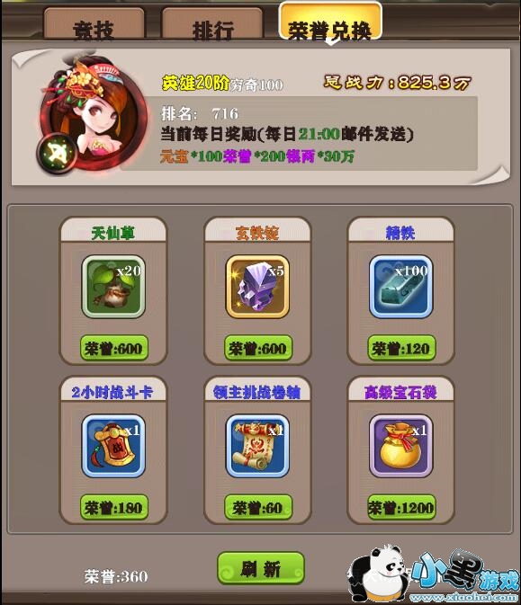 在竞技场里有一个威望兑换商店,竞技场里的威望商店可以通过威望值来购买需要的物品,威望值就是挑战其他玩家后获得的奖励。 没有需要的物品可以刷新一下商店页面,刷新只需要消耗少量威望值。