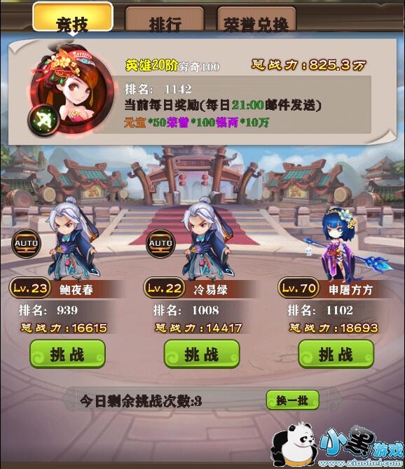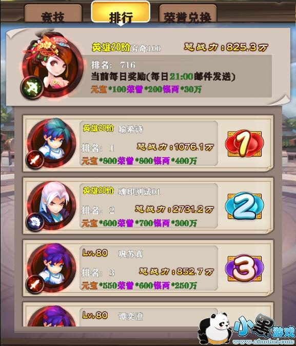 每天的21:00系统会进行排名结算,竞技场每日奖励会以邮件的方式发送。可获得大量元宝 银两 威望,根据排名发送。