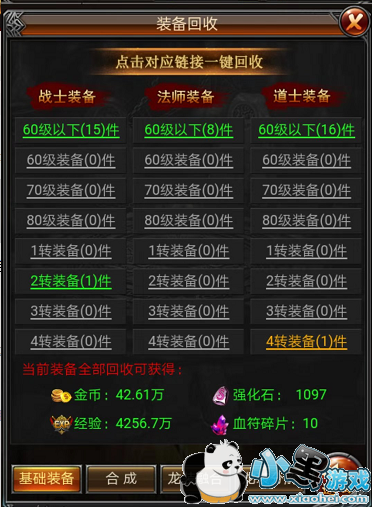打开背包界面就能看到回收装备的按钮,点开,按职业等级回收不需要的装备,千万别点错,3转以上的装备可以合成圣装、神装;武器和衣服的回收价值会比首饰等装备高。