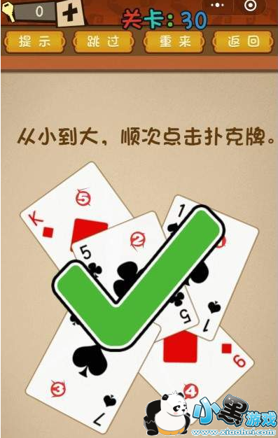 《微信最强大脑乱斗》第30关怎么过?第30关从小到大,顺次点击扑克牌。很熟悉的一道题目,这道题的顺序就没那么简单了,下面我们来看下正确的答案是什么吧!