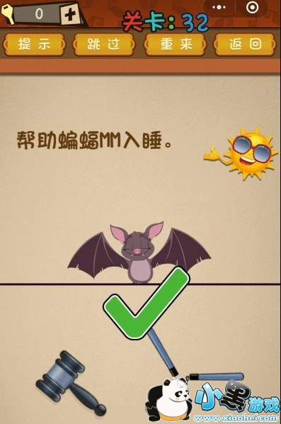 《微信最强大脑乱斗》第32关怎么过?第32关帮助蝙蝠MM入睡,看到下面有两个工具,其实这个就是个障眼法,最主要的是你要知道蝙蝠在生活中睡觉的姿势,下面我们来看下正确的答案是什么吧!