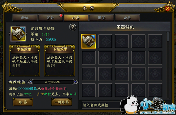 圣器可培养升级,培养消耗圣器培养丹或者人物经验,升级后圣器效果会变的更强哦!