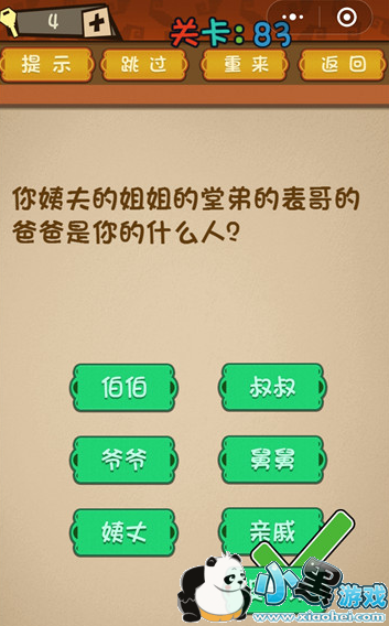 《微信最强大脑乱斗》第83关怎么过?第83关你姨夫的姐姐的堂弟的表哥的爸爸是你的什么人?如果你观看题目估计这个关系你也看不懂,不过在答案中有个最简单,所以下面我们来看下正确的答案是什么吧!