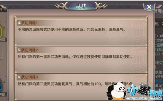 第一流派和第二流派武功消耗体系有所不同,第一流派武功无消耗,第二流派武功需消耗真气。