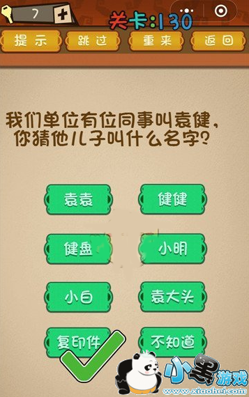 《微信最强大脑乱斗》第130关怎么过?第130关我们单位有位同时叫袁健,你猜他儿子叫什么名字?这一题非常有趣,因为这样的名字没有一点脑洞你确实是想不到的,下面我们来看下正确的答案是什么吧!