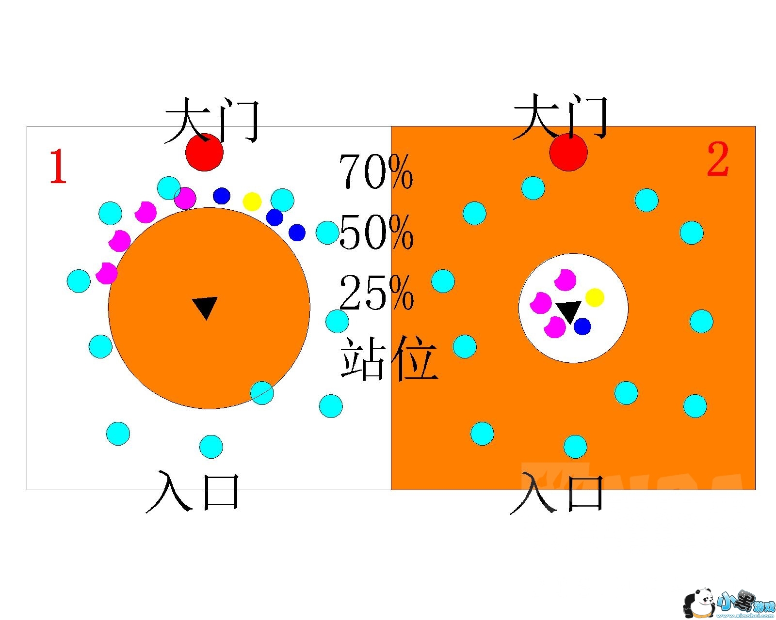 75%50%25%阶段大招:bOSS在任何位置都会在这个血量回中心放大招,躲避方法如下图二!知道方法就好躲了 特点:两阶段。一阶段出去 二阶段进来 如下图二中 1和2