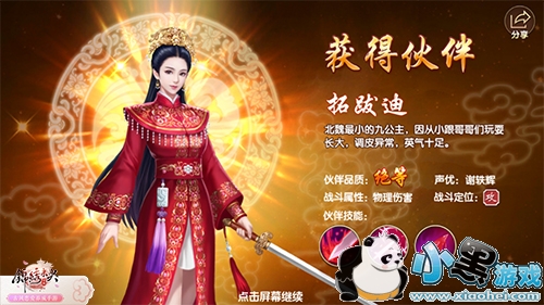 5、不同伙伴提供的属性有所区别, 品质越高的伙伴提供给小主们的属性加成越多。伙伴亲密度、伙伴学识,都可大幅提升伙伴属性。伙伴诰封后,可以解锁关键技能,强化技能,大幅提升战斗属性。诰封所需的道具,可以从抵抗封地外敌入侵,参加宴会,以及各种商店中获得。