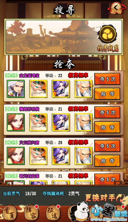 我们有两种方式可以获得对应的残篇。搜寻或者抢夺。搜寻是通过消耗灵气来进行搜寻,每两个灵气可以有一个对应的获得残篇机会。抢夺也是,我们获取残篇的一个办法,同样也是消耗2的灵气哦!抢夺难度较高的敌人,会有较高的几率获得残篇哦!