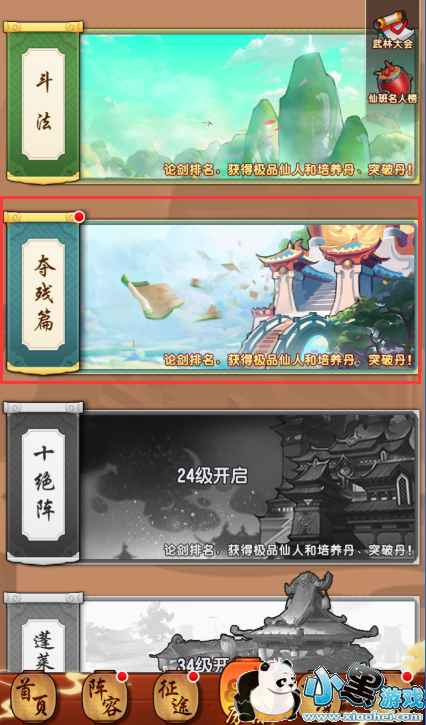 在主界面中,我们点开历练按钮,我们就可以看到夺残篇功能啦!