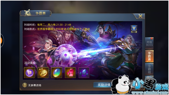 在每周二、周六晚21:30-21:48,将会开放争霸赛,即世界服争霸榜上的玩家们进入地图进行个人混战。争霸榜1-30名获得参与巅峰争霸赛资格,分为一组进入战场进行战斗;争霸榜31-100名获得参与高手争霸赛资格,分为两组,分别进入战场进行战斗。