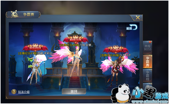 巅峰争霸赛前3名玩家可以获得稀有荣耀称号,登榜名人堂,名人堂榜单每次争霸赛结束后刷新。开启世界服之后的全服玩家每天都可以在名人堂崇拜1次,崇拜后可获得经验及崇拜礼包奖励,礼包可随机开出离线挂机卡、初级经验药剂、扫荡券或若干金币。