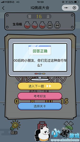 《微信iq挑战大会》第16关怎么过?第16关的题目是后轮转10圈前轮会转多少圈,这一关其实要看清楚这个自行车停放时后轮处于什么状态就可以了,那么下面我们就来看下这一关的答案吧。