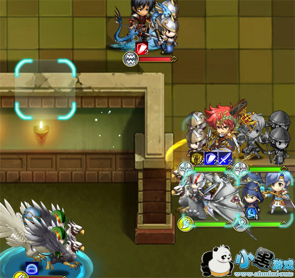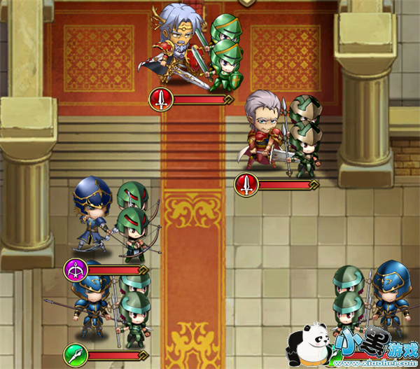 第一回合:我方应该不管下方两个飞兵,直接全体上移,雷丁开启神卫保护队友,如果此时雷丁的练度比较高,可以将雷丁放在上方,开局上2左1开启神卫接对方三个小兵,如果不能则可缓慢前行。