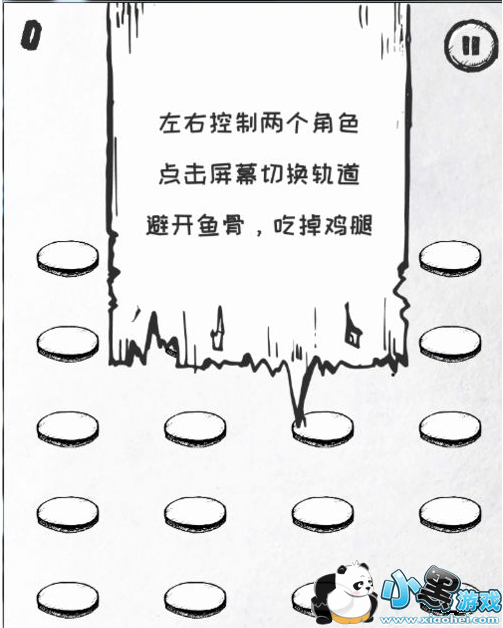 左右控制两个角色,点击屏幕切换轨道,避开鱼骨头,吃掉鸡腿。路过鸡腿没有吃也算失败。