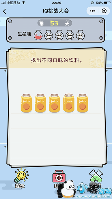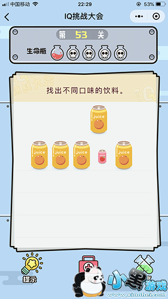 《微信iq挑战大会》第53关怎么过?第53关的题目是找出不同口味的饮料?图中的四瓶怎么才知道味道口味不一样呢,又不能喝,但是没人说不能移动吧?那么下面我们就来看下这一关的答案吧。