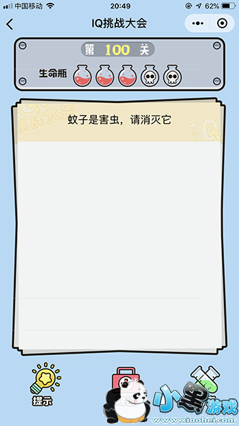 《微信iq挑战大会》第100关怎么过?第100关的题目是蚊子是害虫消灭它?蚊子大家当然都不喜欢,但是在图中应该怎么做才能消灭掉蚊子咧?那么下面我们就来看下这一关的答案吧。