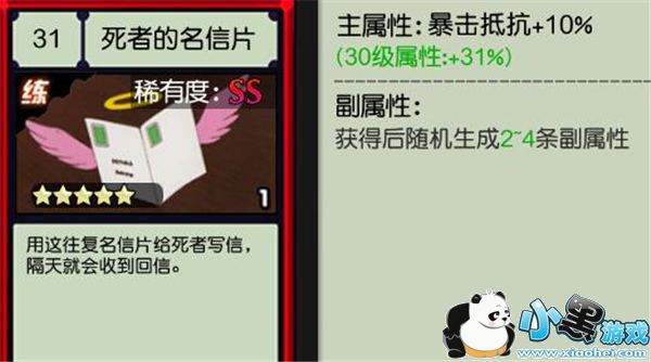 1.死者的明信片,抗暴的好卡。主属性:满级暴击抵抗+31%,副属性随机生成。