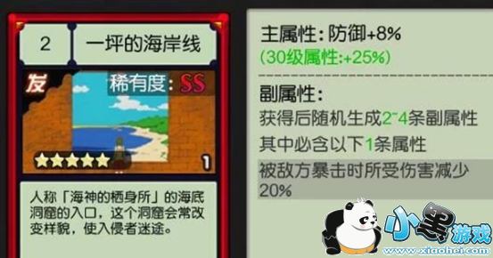 3.一坪的海岸线,加防卡。主属性:满级防御+25%,副属性:减少敌方暴击伤害20%。