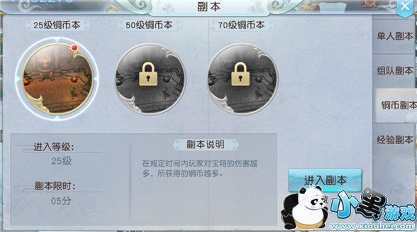 铜币分为25级、50级和70级的铜币副本。
