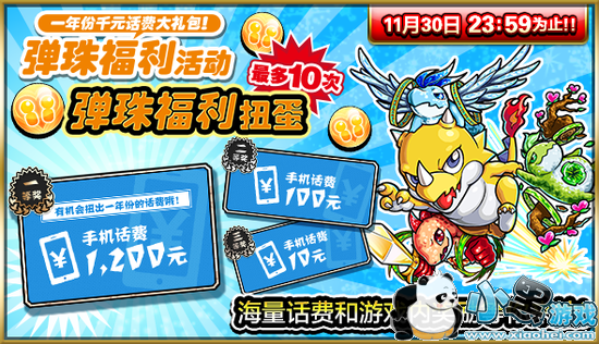 从11月17日开始到11月30日之间,<<怪物弹珠>>将为国服玩家送上总价值逾万元的话费大礼包!抽“弹珠福利扭蛋”,就有机会赢取三种奖额的话费大奖。赢取话费大奖后,从此“流量难民”咸鱼大翻身成为“流量富豪”!