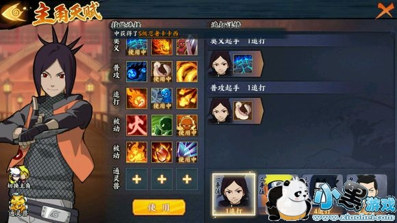 建议:战力2w2+,将最高的忍术和体术装备给佐助和A鸣 。