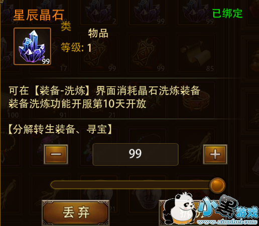 星辰晶石可在“锻造-装备洗炼”界面消耗晶石洗炼装备,提升装备属性,装备洗炼功能会在 开服第10天后开启。除了福利活动赠送的星辰晶石外,我们还可以通过分解转生装备和探宝活动来获取星辰晶石。