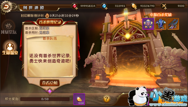服务器中第一个击杀本层创世神殿4个boss的队伍可获得首杀奖励:绝版称号和时装。首杀队伍只有一个,他们击杀所用时间会作为本服务器的首杀纪录参与世界首杀纪录排名。