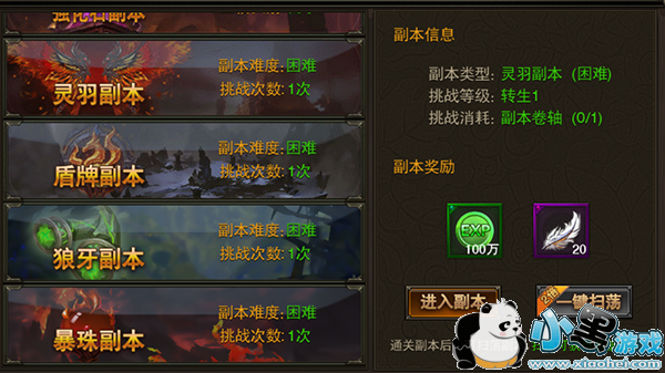 副本使者每天能够完成五次,副本分为强化石副本、灵羽副本、盾牌副本、狼牙副本、爆珠副本,每个副本每天可单独完成一次,完成副本掉落大量的经验和升级装备和法宝所需要的材料。