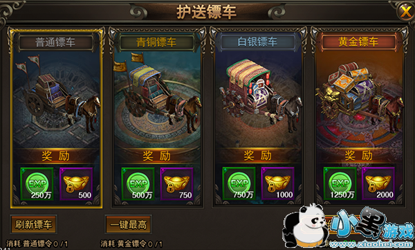 镖局押镖每天能够完成两次,完成任务奖励大量的经验和绑定元宝。接取任务之后,你需要护送镖车到达安全的地点,镖车分为普通镖车、青铜镖车、白银镖车、黄金镖车,奖励变高,可以使用镖令来刷新镖车。使用普通镖令刷到白银镖车基本就能做了,刷到黄金镖车耗费的镖令太多了。