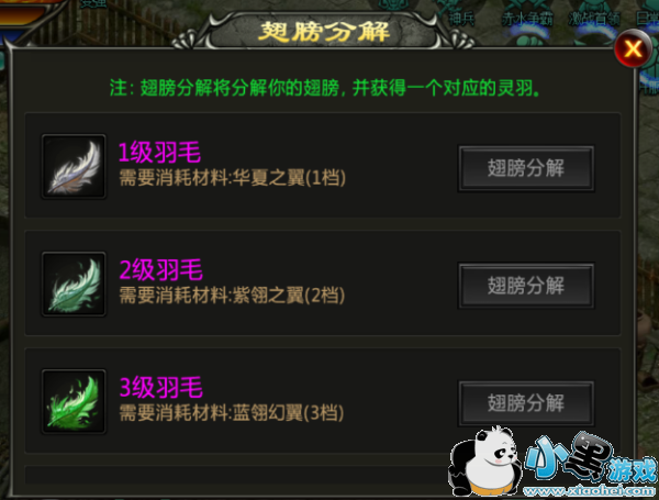 各位小伙伴多余的低级翅膀和羽毛也可以通过NPC马大哈分解(华夏城58.110)和合成升级为高级羽毛来升级身上的羽毛,是不是很贴心!