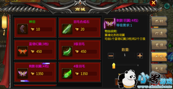玩家的第一个翅膀可以由主线任务获取到,接下来就需要玩家耐心的的培养或者在商城直接购买4档羽翼-刺影羽翼更快一步的领先其他玩家