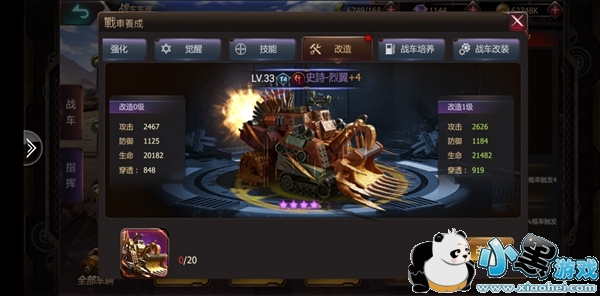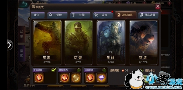 战车的改造则需要消耗,同名的碎片来提升战车的战斗力。战车改装需要制定的零件和对应的材料。战车培养主要是围绕战车的基础属性来提升,攻击、防御、生命、穿透。培养则分为基础培养、高级培养和顶级培养。普通培养仅消耗材料,高级培养则消耗材料和金币,顶级培养消耗材料和钻石。