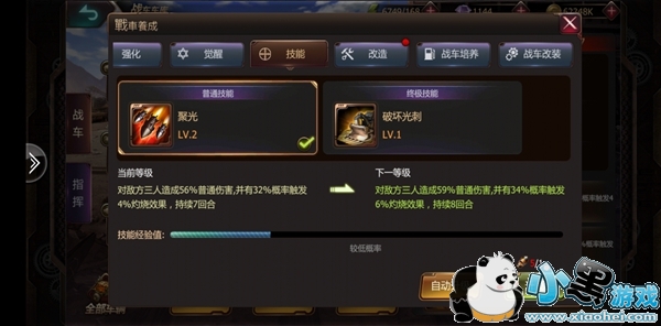 首先是技能系统,每辆战车有三种技能,分别是普通技能,终极技能,队长技能。队长技能是当战车放置在队长位时才触发的技能,同时无法升级。而终极技能则是战车主要的输出技能,但是有冷区时间。普通技能则无冷区时间,因此主要是在终极技能CD的时候保持输出的技能。技能升级需要消耗材料,每次消耗材料时,技能的经验都会增加,并且在过程中有一定的概率直接升级,如果经验值满了则必升级。技能升级则可提升战车伤害,持续回合,触发概率等。